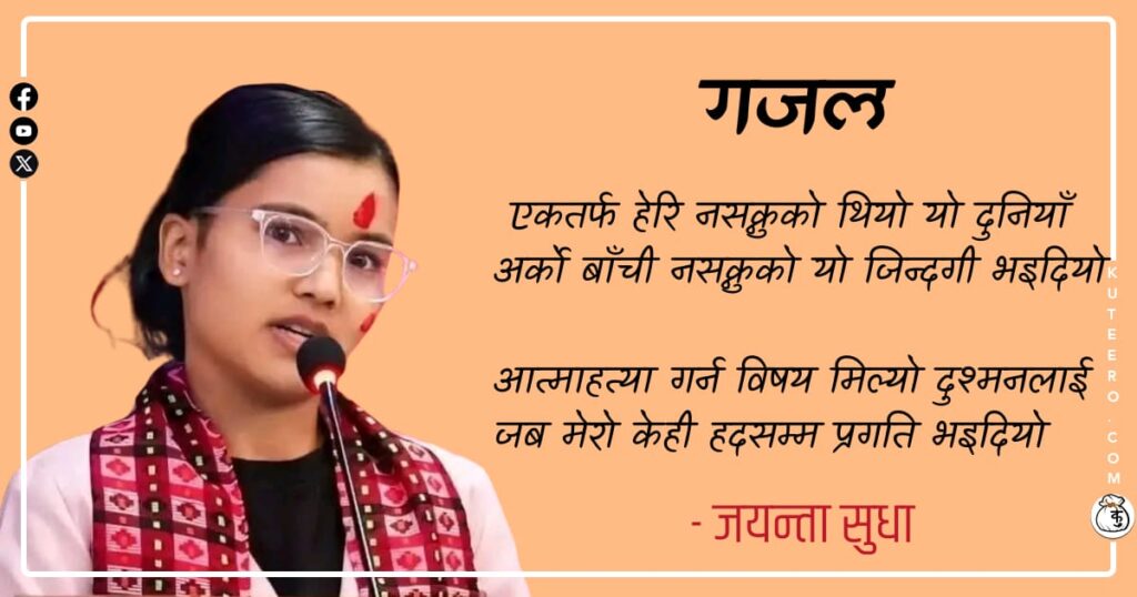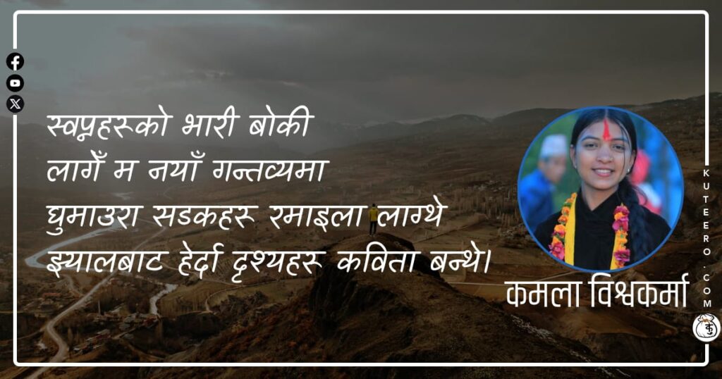 जब यात्रा तय गरियोबिसाएर घरको आँगन,चढेँ म गाडीमास्वप्नहरूको भारी बोकीलागेँ म नयाँ गन्तव्यममा घुमाउरा सडकहरू रमाइला लाग्थेझ्यालबाट हेर्दा दृश्यहरू कविता बन्थे।हावा परेड खेल्थ्यो मेरो कपालसँगकहिले सिरक झैँ ढाक्थ्यो मेरो अनुहारकहिले गीत गाएर हावाको संगीतमासास फेर्न सजिलो बनाउँथ्यो।कुनैकुनै मोडमा मन डराउँथ्यो पनि,जहाँ शरीरलाई असहज बनाउथ्योबटुवाहरूको भिडमा हराउँछु कि भनी।टायरको घर्षणमालुकेका थिए स्वरहरूएक्लोपन, उत्साह,र भविष्यका रहरहरूचालकको अनुहारमाजीवनको […]
