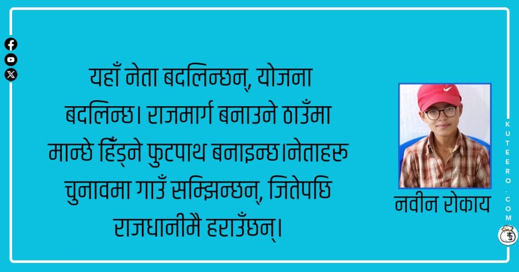 यहाँ नेता बदलिन्छन्, योजना बदलिन्छ। राजमार्ग बनाउने ठाउँमा मान्छे हिँड्ने फुटपाथ बनाइन्छ।नेताहरू चुनावमा गाउँ सम्झिन्छन्, जितेपछि राजधानीमै हराउँछन्। नेपाल देश गजबको देश हो। यहाँ योजना पास कागजमै हुन्छ। सडक बनाउँदा बनाउँदै कोच्चिन्छ । काम भन्दा पनि कमिसन अगाडि तय हुन्छ, अनि मात्र विकासको नक्सा कोरिन्छ। यहाँ नेता बदलिन्छन्, योजना बदलिन्छ। राजमार्ग बनाउने ठाउँमा मान्छे हिँड्ने […]