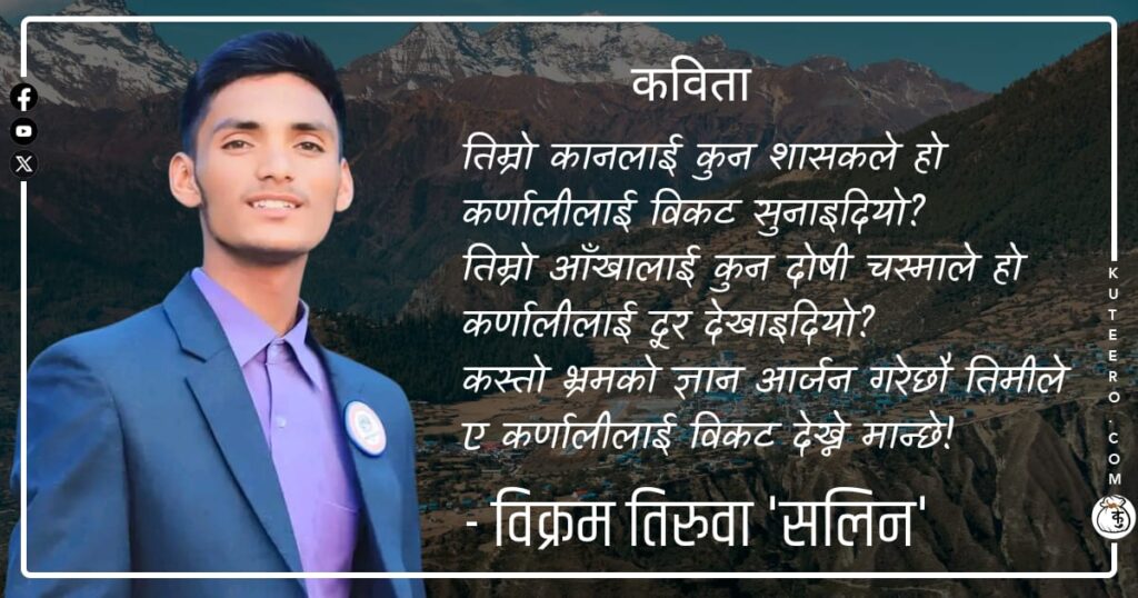 जब मान्छेहरुले कर्णाली सुन्दछन्तब मान्छेहरु हतारिन्छन् र मलाईविकट नामकरण गर्न एक पाइला पछि हट्दैनन्र मेरो परिचय बन्छ विकट कर्णाली ! तिम्रो कानलाई कुन शासकले होकर्णालीलाई विकट सुनाइदियो?तिम्रो आँखालाई कुन दोषी चस्माले होकर्णालीलाई दूर देखाइदियो?कस्तो भ्रमको ज्ञान आर्जन गरेछौ तिमीलेए कर्णालीलाई विकट देख्ने मान्छे !म कर्णाली बोल्दै छु। एकपटक तिमीले मलाई आफ्नोसामीप्यमा राख अनिअनुभूति गर्नेछौं म […]