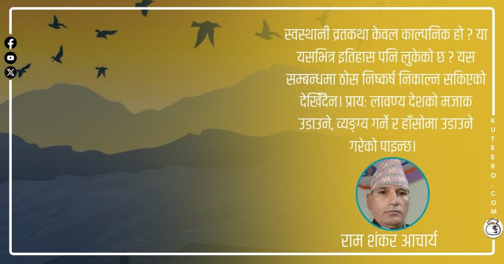अब अर्को प्रश्न उठ्छ, के शिवले राज चलाएका थिए त ? यस विषयमा खोज्दा शिवले कैलाश पर्वतमा बसेर आफ्ना गणहरू र दिक्पालहरूलाई सम्पूर्ण प्राणीको संरक्षण गर्न लगाएका थिए। सन्तान धर्मालम्बी समाजमा आजभोलि स्वस्थानी व्रतकथा सुरु भइरहेको छ। यो कथा भगवान् शिवसँग सम्बन्धित रहेको छ भने लावण्य देशका राजा नमराजको प्रसङ्ग पनि जोडिएको छ। स्वस्थानी व्रतकथाले […]