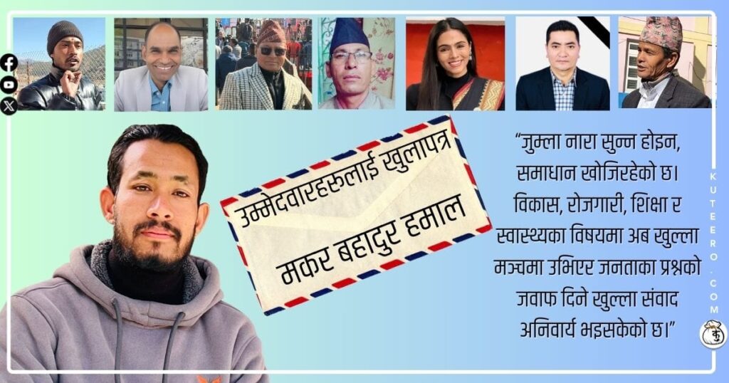 (जनताको प्रश्न, नेताको जवाफदेहिता) आदरणीय!जुम्ला जिल्लाबाट प्रतिनिधि सभा सदस्य निर्वाचन २०८२ मा उम्मेदवारी दिनु भएकासम्पूर्ण राजनीतिक दलका नेता तथा स्वतन्त्र उम्मेदवारज्यूहरू, नमस्कार। यो पत्र कुनै दल, गुट वा व्यक्तिको पक्षमा होइन।यो जुम्लाका जनताको पीडा, प्रश्न र भविष्यको आवाज हो। हामीले दशकौँदेखि भाषण सुन्दै आएका छौँ,अब जवाफ चाहिएको छ। त्यसैले तपाईँहरू सबैलाई खुल्ला मञ्चमा जनतासँग प्रत्यक्ष […]