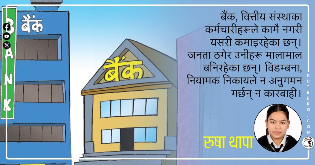 बैंक, वित्तीय संस्थाका कर्मचारीहरूले कामै नगरी यसरी कमाइरहेका छन्। जनता ठगेर उनीहरू मालामाल बनिरहेका छन्। विडम्बना, नियामक निकायले न अनुगमन गर्छन् न कारबाही। बैंक, वित्तीय संस्थाले केसम्म गर्दैनन्? बाध्य गरिसाध्य छैन। एउटा ऋणीसँग मिलेर बैंकका कर्मचारीले अर्को ऋणीलाई डुबाइरहेका छन्। बैंक तथा वित्तीय संस्थामा कसको कति निक्षेप छ? कसले कति कर्जा लिएका छन्? सम्बन्धित बचतकर्ता, […]