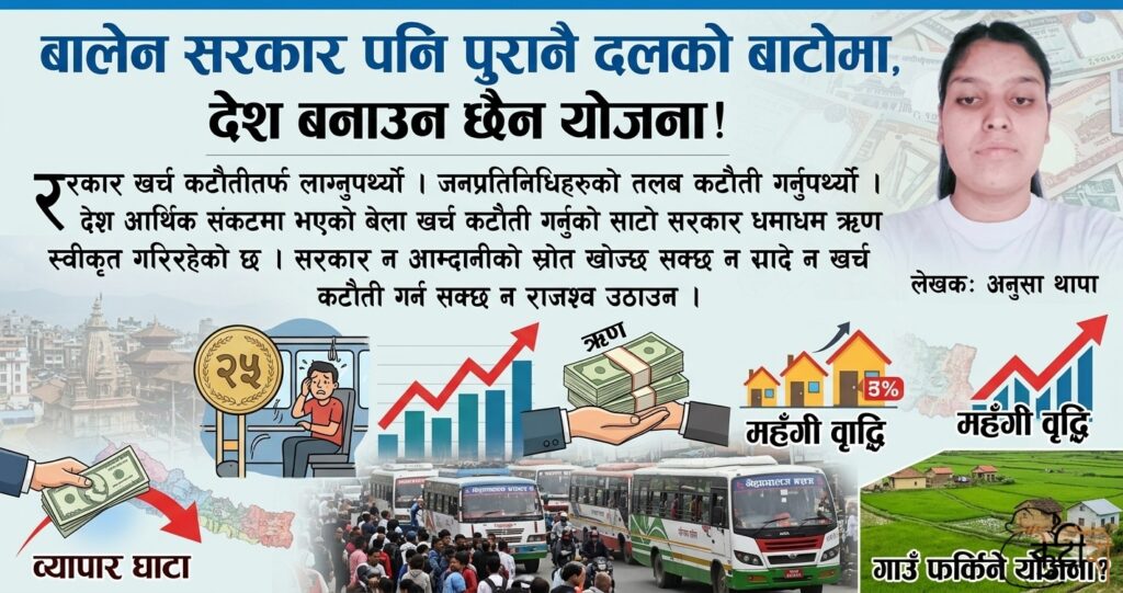 रकार खर्च कटौतीतर्फ लाग्नुपर्थ्यो । जनप्रतिनिधिहरुको तलब कटौती गर्नुपर्थ्यो । देश आर्थिक संकटमा भएको बेला खर्च कटौती गर्नुको साटो सरकार धमाधम ऋण स्वीकृत गरिरहेको छ । सरकार न आम्दानीको स्रोत खोज्छ सक्छ न खर्च कटौती गर्न सक्छ न राजश्व उठाउन । बालेन्द साह नेतृत्वको सरकारले सार्वजनिक तथा मालवाहक सवारी साधनको भाडा वृद्धि गरेको छ । […]