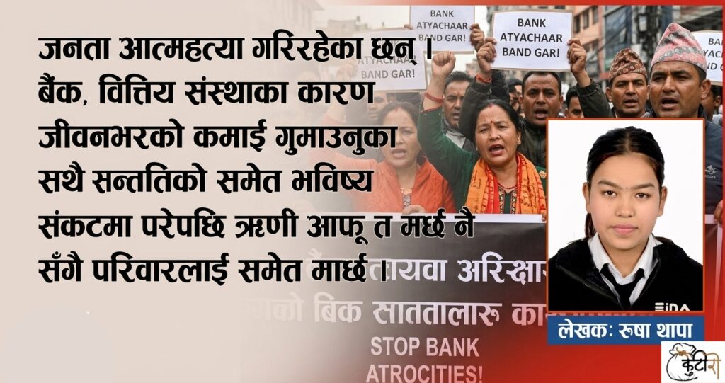 जनता आत्महत्या गरिरहेका छन् । बैंक, वित्तिय संस्थाका कारण जीवनभरको कमाई गुमाउनुका साथै सन्ततिको समेत भविष्य संकटमा परेपछि ऋणी आफू त मर्छ नै सँगै परिवारलाई समेत मार्छ । पछिल्लो स्थानीय तहहरुमा बाक्लो भीडभाड देखिन्छ । तर, त्यो भीड न स्थानीय नागरिकको हो न कर तिर्नेको, त्यो सिफारिसको भीड हो । तैपनि बैंक, वित्तिय संस्थाका कर्मचारीहरुको […]