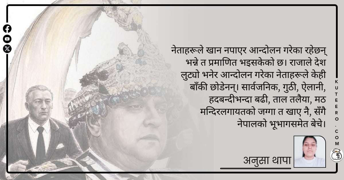 जनता विदेशमा बेचेका थिएनन् । जनताहरूले आफैंले दुःख गरेर खाइरहेका थिए । देशमा उद्योगहरू थिए । नेपाल आफ्नै उब्जनीमा निर्भर थियो । राजाले देश जोगाए, देश बेच्न पाइएन, विदेशी ऋण ल्याएर देश बेच्न पाइएन भनेर नेताहरूले जनता उचाले । जनता पनि होला भनेर सडकमा आए । अहिले देश नै सकिएपछि जनताले पछुताप मानिरहेका छन् । नेताहरूले देशको लागि होइन, आफ्नो व्यक्तिगत स्वार्थका लागि लडेका थिए भनेर जनताले बुझ्दै गएका छन् । नेताहरूकै आज देश खरानी बन्यो । नेताहरूकै कारण गत भदौ २३ र २४ गतेको आन्दोलन भयो ।