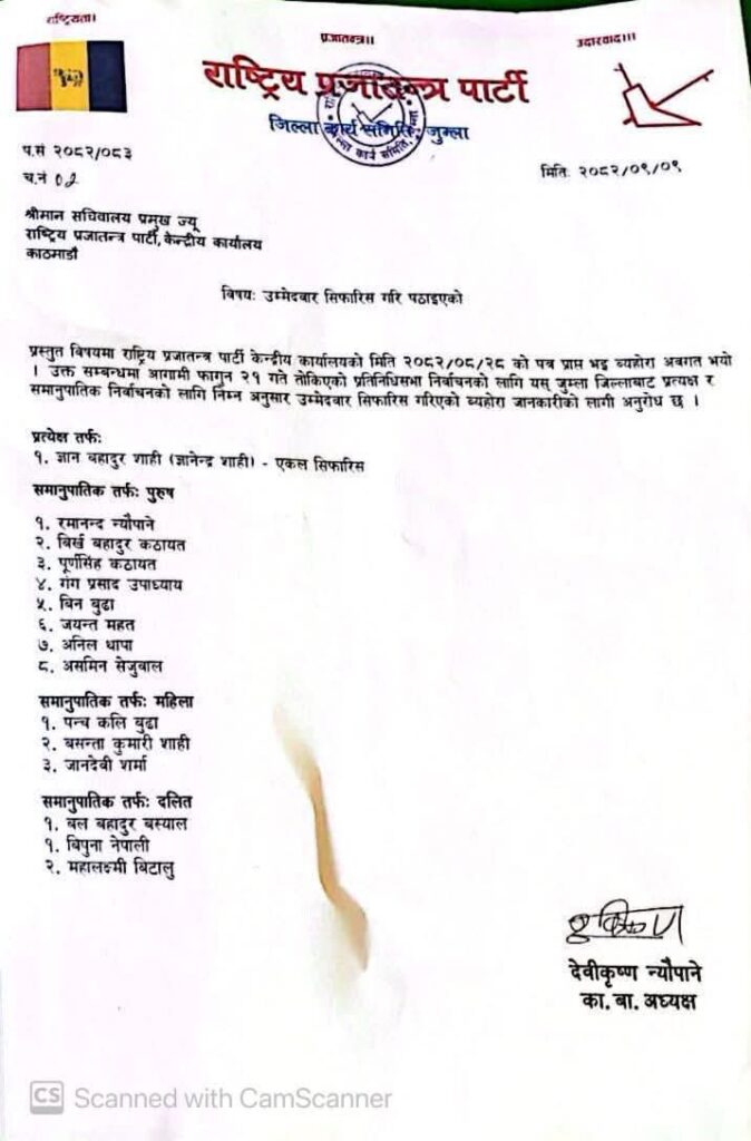 राप्रपा जिल्ला कार्यसमिति जुम्लाले पार्टीको केन्द्रीय कार्यालय काठमाडौंलाई पठाएको पत्रमार्फत प्रत्यक्ष तथा समानुपातिक प्रणालीअन्तर्गत उम्मेदवारहरूको नाम सिफारिस गरेको हो।