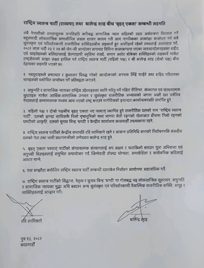 राष्ट्रिय स्वतन्त्र पार्टीका सभापति रवि लामिछाने र काठमाडौं महानगरपालिकाका मेयर बालेन्द्र शाह (बालेन)बीच सहमति भएको छ।