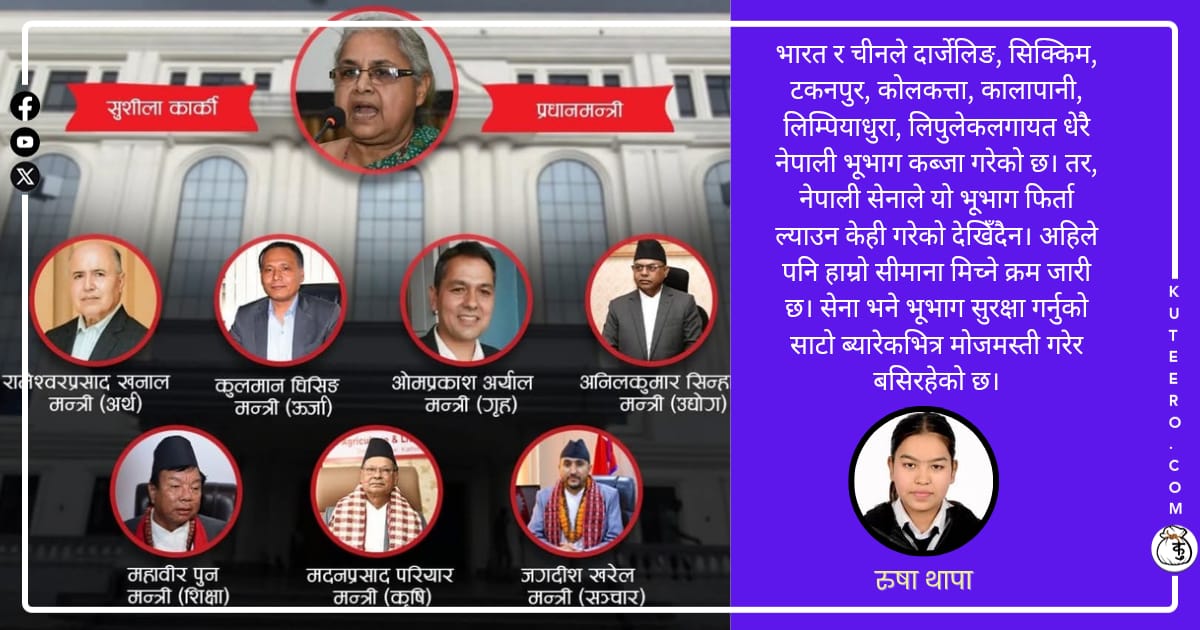 भारत र चीनले दार्जेलिङ, सिक्किम, टकनपुर, कोलकत्ता, कालापानी, लिम्पियाधुरा, लिपुलेकलगायत धेरै नेपाली भूभाग कब्जा गरेको छ। तर, नेपाली सेनाले यो भूभाग फिर्ता ल्याउन केही गरेको देखिँदैन। अहिले पनि हाम्रो सीमाना मिच्ने क्रम जारी छ। सेना भने भूभाग सुरक्षा गर्नुको साटो ब्यारेकभित्र मोजमस्ती गरेर बसिरहेको छ।