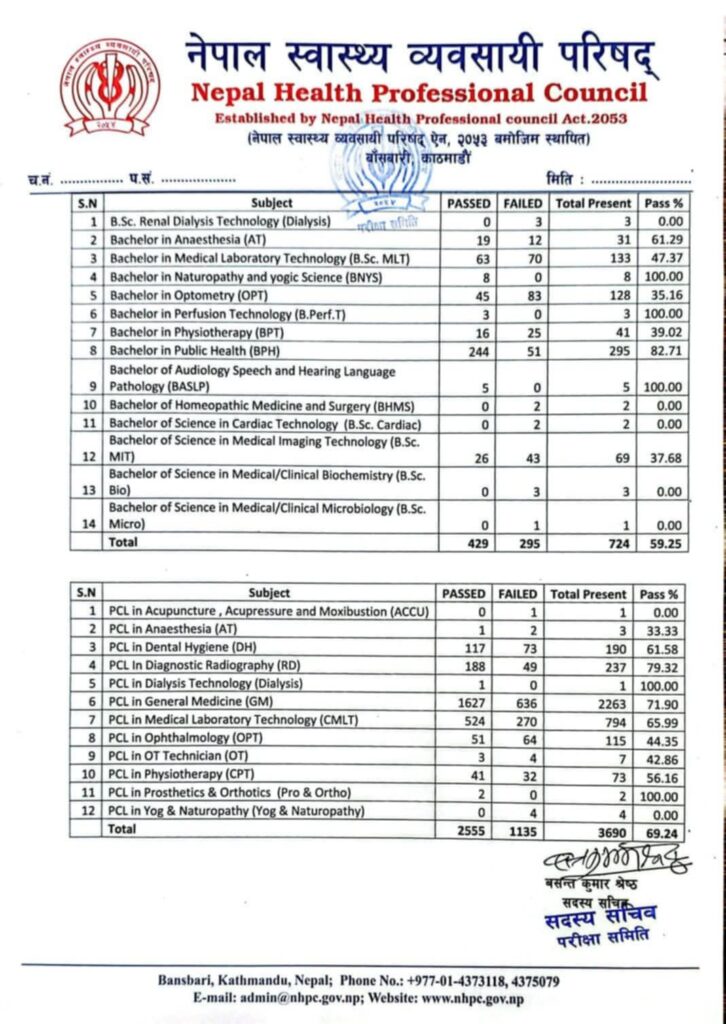कर्णाली स्वास्थ्य विज्ञान प्रतिष्ठानको जनस्वास्थ्य महाविद्यालयको स्नातक तहका विद्यार्थीहरूले नेपाल स्वास्थ्य व्यावसायिक परिषद्को परीक्षामा शतप्रतिशत नतिजा ल्याएका छन्।