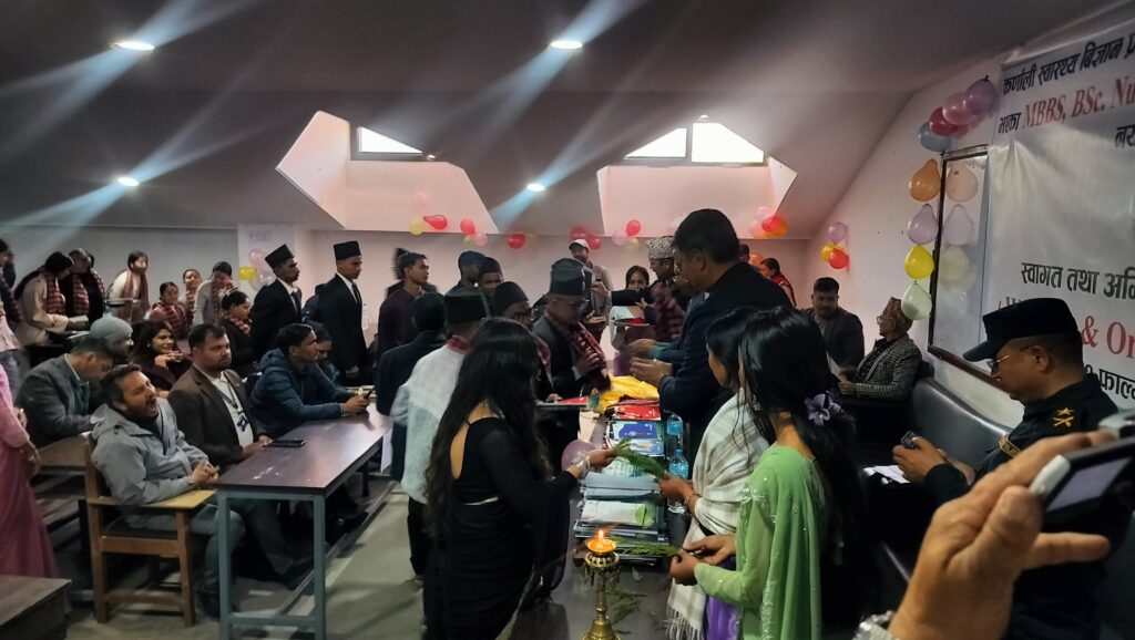 आज एक कार्यक्रमकाबीच कर्णाली स्वास्थ्य विज्ञान प्रतिष्ठान जुम्लाको शैक्षिक शत्र २०८२ मा भर्ना भएका एम.बी.बी.एस, बी.एससी, नर्सिङ, बी एन.एस, बी.पी.एस, र बी फार्माका नयाँ विद्यार्थीहरूलाई स्वागत तथा अभिमुखिकरण कार्यक्रम गरिएको हो।