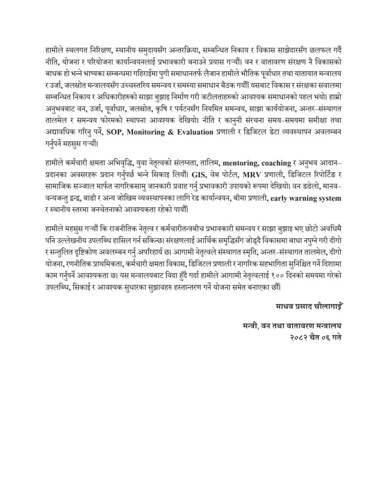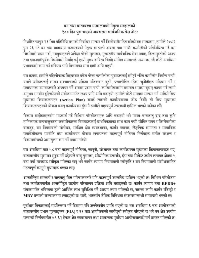 मन्त्री माधव चौलागाईंले वन तथा वातावरण मन्त्रालयको नेतृत्व सम्हालेको १०० दिन पूरा भएको अवसरमा सार्वजनिक गरिएको प्रेस नोटले छोटो अवधिमा पनि नीतिगत, संस्थागत र कार्यक्रमगत तहमा उल्लेखनीय प्रगति सम्भव रहेको देखाएको छ। मन्त्री चौलागाईंले प्रस्तुत गरेको विवरणअनुसार मन्त्रालयले सुशासन, पारदर्शिता र परिणाममुखी कार्यशैलीलाई केन्द्रमा राख्दै संरक्षण र विकासबीच सन्तुलन कायम गर्ने प्रयासलाई प्राथमिकता दिएको छ।