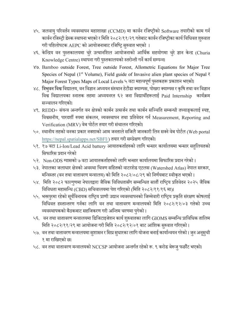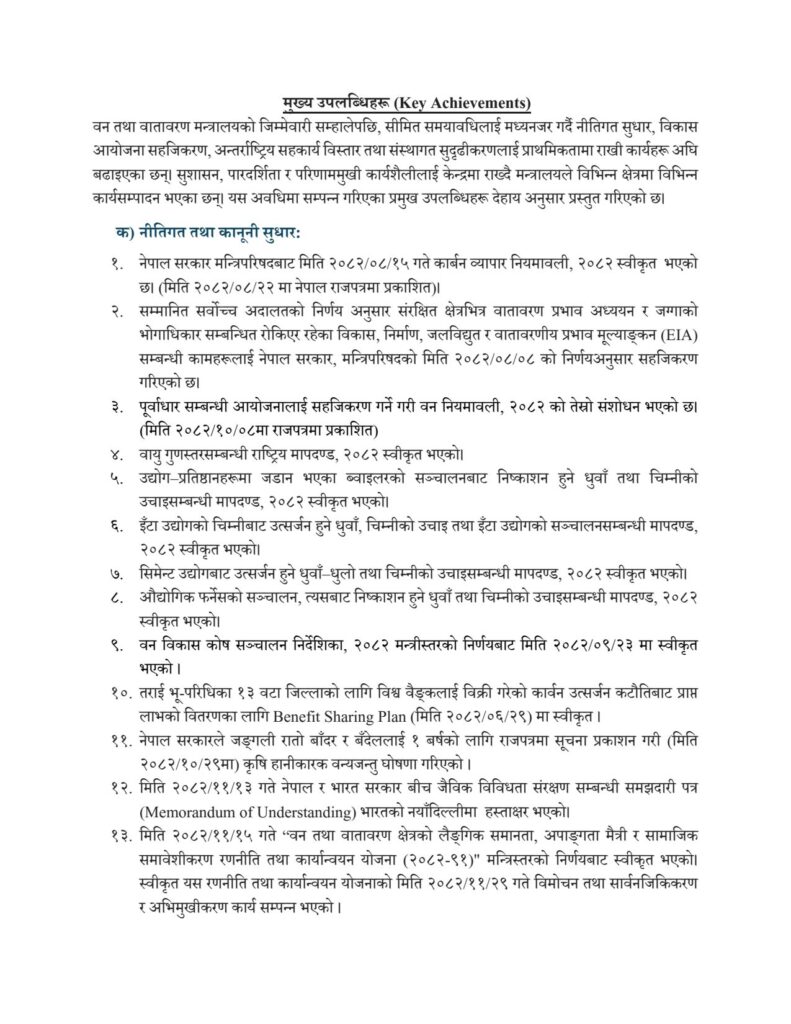 १०० दिनको अवधिमा मन्त्रालयले ५८ वटा नीतिगत, कानुनी, संस्थागत तथा कार्यक्रमगत सुधारका कार्यहरू सम्पन्न गरेको जनाएको छ। यसअन्तर्गत कार्बन व्यापार नियमावली, २०८२ स्वीकृति, वन नियमावली संशोधन, वायु गुणस्तरसम्बन्धी राष्ट्रिय मापदण्ड निर्माण, तथा औद्योगिक उत्सर्जन नियन्त्रणका लागि विभिन्न मापदण्ड लागू गरिएको छ। इँटा, सिमेन्ट तथा फर्नेस उद्योगका लागि छुट्टाछुट्टै उत्सर्जन मापदण्ड निर्धारण गरिनु वातावरणीय सुशासन सुदृढ गर्ने महत्वपूर्ण कदमका रूपमा लिइएको छ।