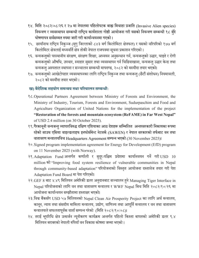 अन्तर्राष्ट्रिय सहकार्य र जलवायु वित्त परिचालनतर्फ पनि मन्त्रालयले महत्वपूर्ण उपलब्धि हासिल गरेको छ। विश्व बैंकसँग ५७ मिलियन अमेरिकी डलर बराबरको “नेपाल क्लिन एयर प्रोसपेरिटी प्रोजेक्ट” सम्बन्धी वार्ता सम्पन्न भएको छ भने विभिन्न परियोजनामार्फत करोडौं डलर बराबरको सहयोग परिचालन प्रक्रिया अघि बढाइएको छ। कार्बन व्यापार तथा आरईडीडी संयन्त्रमार्फत भविष्यमा ठूलो आर्थिक लाभ सुनिश्चित गर्ने आधार तयार गरिएको छ।