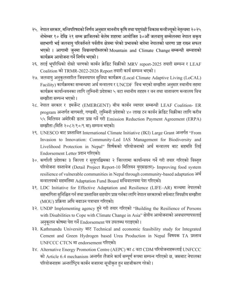 कार्बन रजिष्ट्री तथा MRV (Measurement, Reporting and Verification) प्रणाली सञ्चालनमा ल्याइनुले नेपालको कार्बन व्यवस्थापनलाई थप पारदर्शी र विश्वसनीय बनाउने अपेक्षा गरिएको छ। साथै, LEAF Coalition अन्तर्गत ४० लाख टन कार्बन क्रेडिट बिक्रीमार्फत करिब ५५ मिलियन अमेरिकी डलर प्राप्त गर्ने सम्झौता सम्पन्न हुनु आर्थिक दृष्टिले महत्वपूर्ण उपलब्धि मानिएको छ।