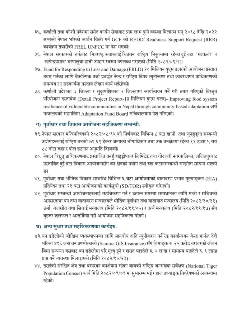 वन क्षेत्र उपयोगसम्बन्धी निर्णयमार्फत ७९.६१ हेक्टर क्षेत्र व्यवस्थापन गरी विभिन्न आयोजना अघि बढाउन मार्ग प्रशस्त गरिएको छ। यसले खानी, ऊर्जा र अन्य पूर्वाधार परियोजनाहरूलाई आवश्यक सहजीकरण उपलब्ध गराएको देखिन्छ। मन्त्रालयले भौतिक पूर्वाधार, ऊर्जा र अर्थ मन्त्रालयसँग समन्वय गरी आयोजना कार्यान्वयनमा देखिएका जटिलता समाधान गर्ने प्रयाससमेत गरेको छ।
