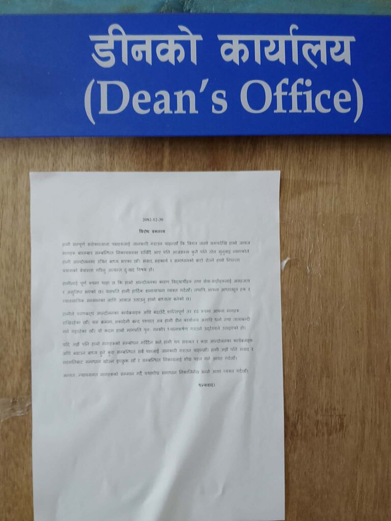 चरणबद्ध आन्दोलनअन्तर्गत चिकित्सकहरूले अब डिन कार्यालय अगाडि धर्ना तथा तालाबन्दी गर्ने कार्यक्रम अघि बढाएका हुन्।