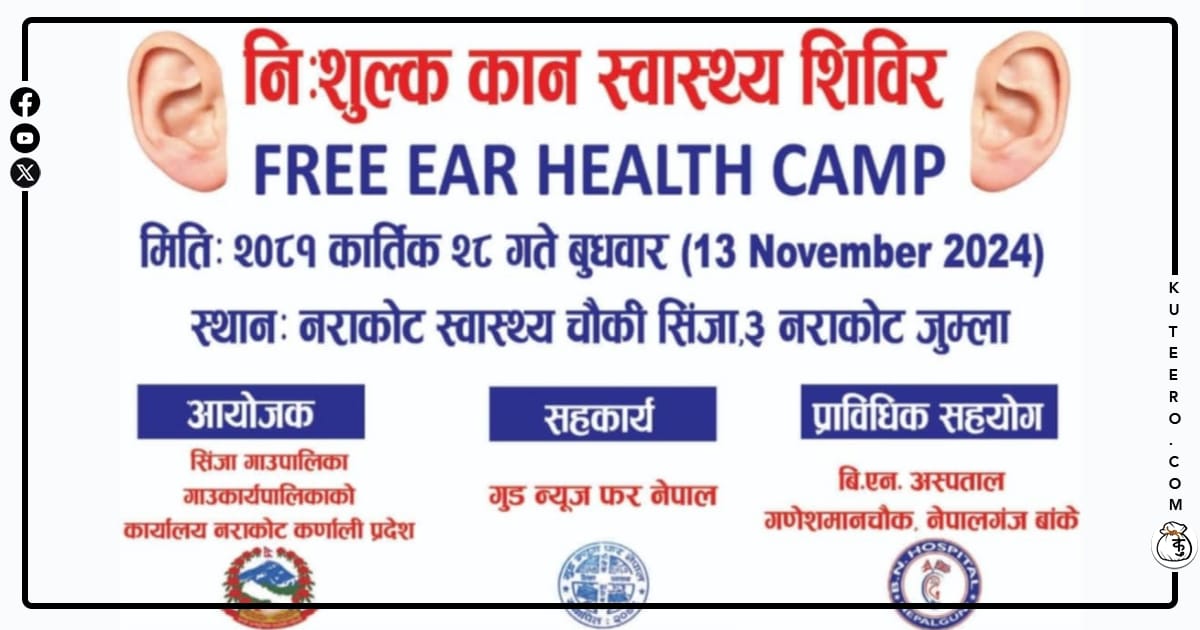 जुम्लाको सिंजा गाउँपालिकामा आगामी कार्तिक २८ गते (बुधबार) नराकोट स्वास्थ्य चौकीमा निशुल्क कान स्वास्थ्य शिविर आयोजना हुने भएको छ। ग्रामीण क्षेत्रमा कान उपचार सेवाको अभावमा विभिन्न कानसम्बन्धी समस्याबाट पीडित नागरिकलाई गुणस्तरीय स्वास्थ्य सेवा प्रदान गर्नु शिविरको उदेश्य रहेको छ।