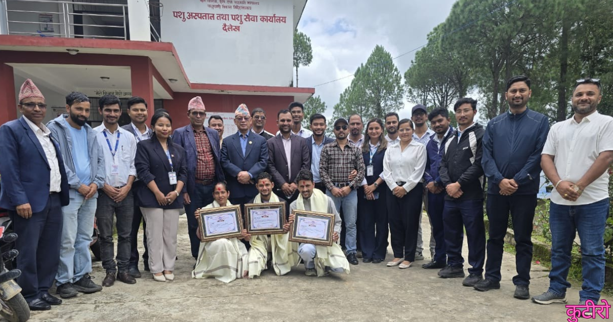पशु अस्पताल तथा पशु सेवा कार्यालय दैलेखको आयोजनामा सम्पन्न जिल्ला स्तरीय मुख्यमन्त्री उत्कृष्ट कृषक पुरस्कार कार्यक्रम अन्तर्गत जिल्लाका तीन उत्कृष्ट कृषकहरूलाई नगदसहित आज सम्मान गरिएको छ।
