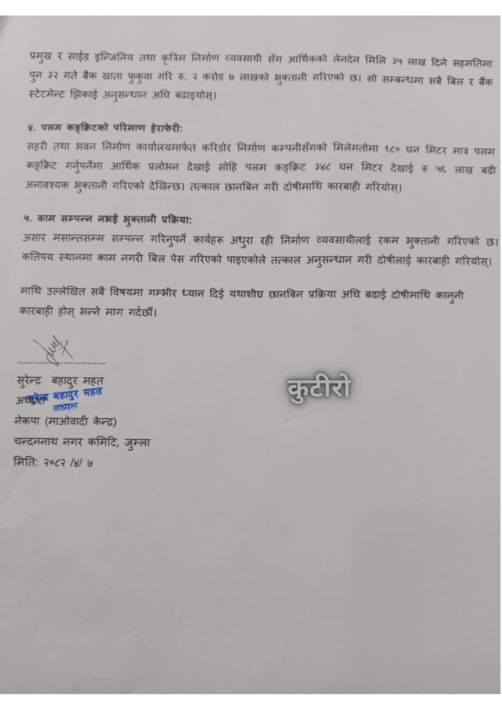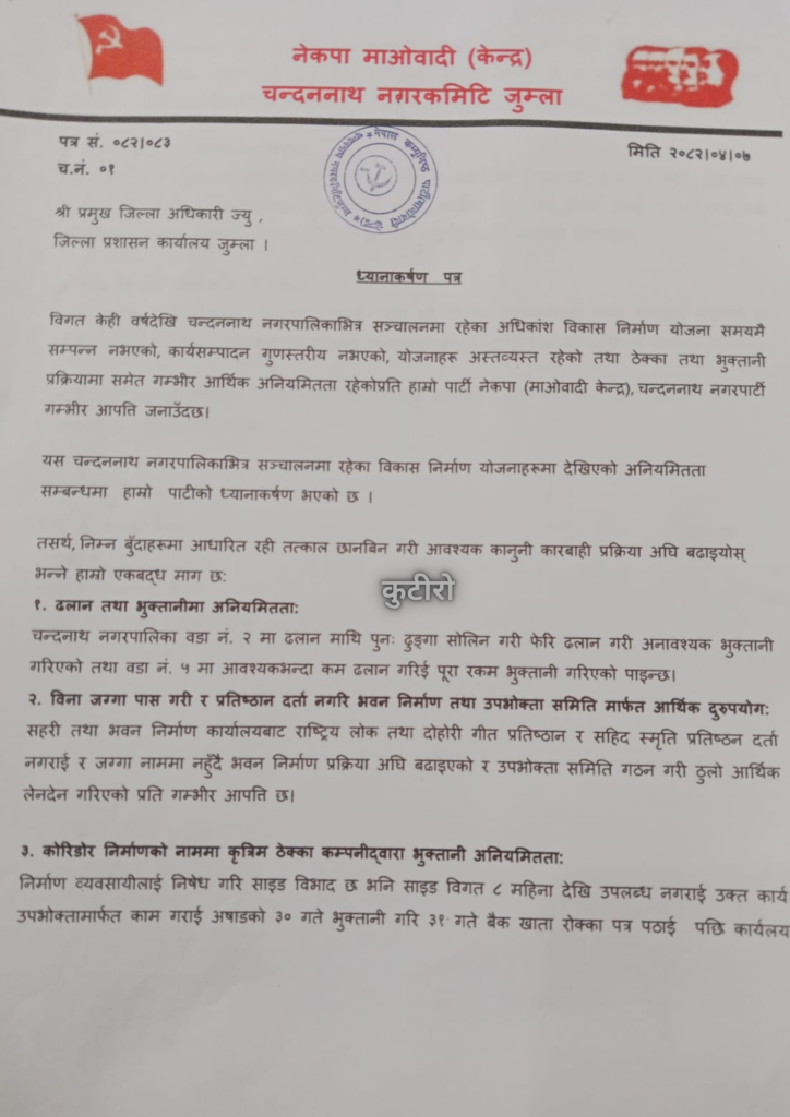 चन्दननाथ नगरपालिकामा पछिल्लो समय विकास निर्माण योजनामा देखिएको अव्यवस्था, ढिलासुस्ती र गम्भीर आर्थिक अनियमितताप्रति नेकपा (माओवादी केन्द्र) चन्दननाथ नगरपार्टीले गम्भीर आपत्ति जनाउँदै जिल्ला प्रशासन कार्यालय, जुम्लामा ध्यानाकर्षण पत्र बुझाएको छ।