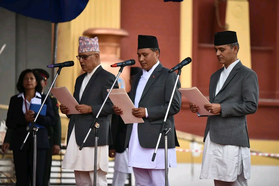 सपथ लिनेमा, अर्थमन्त्रीमा रामेश्वर खनाल, कुलमान घिसिङलाई ऊर्जा, भौतिक पूर्वाधार तथा सहरी विकास मन्त्रालय र अधिवक्ता ओमप्रकाश अर्यालले गृह र कानुन मन्त्रालयको सपथ लिएका हुन् ।