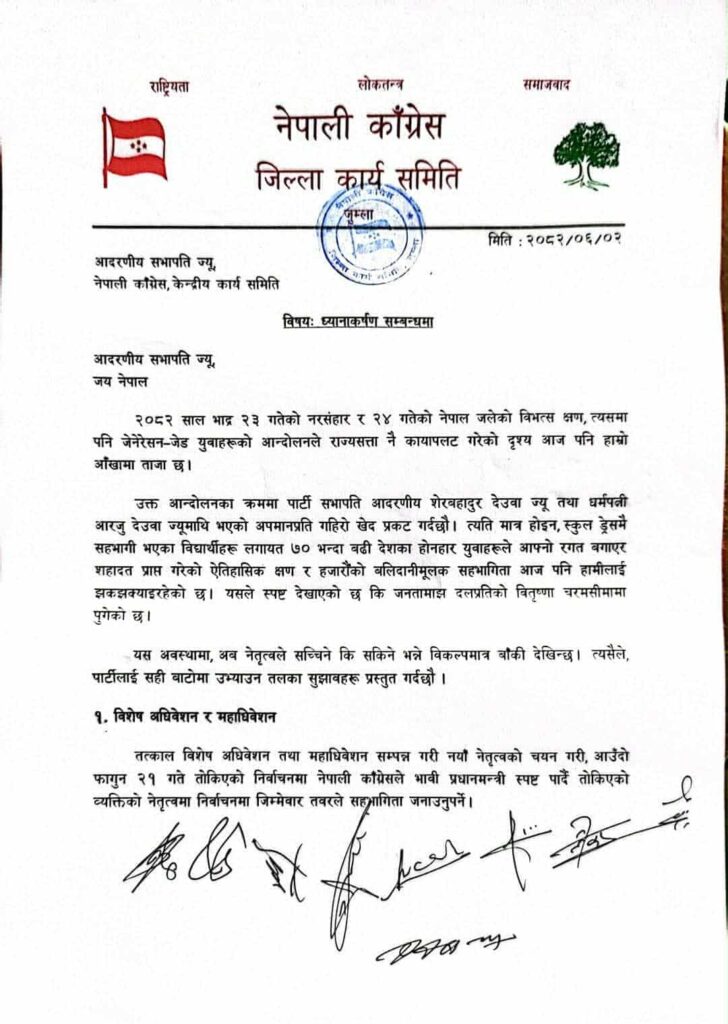 जेन-जी आन्दोलनबाट घाइते भएका काँग्रेस केन्द्रीय सभापति शेरबहादुर देउवा प्रति लक्षित गर्दै नेपाली काङ्ग्रेस जिल्ला कार्यसमितिले आज विज्ञप्ति निकालेको थियो।