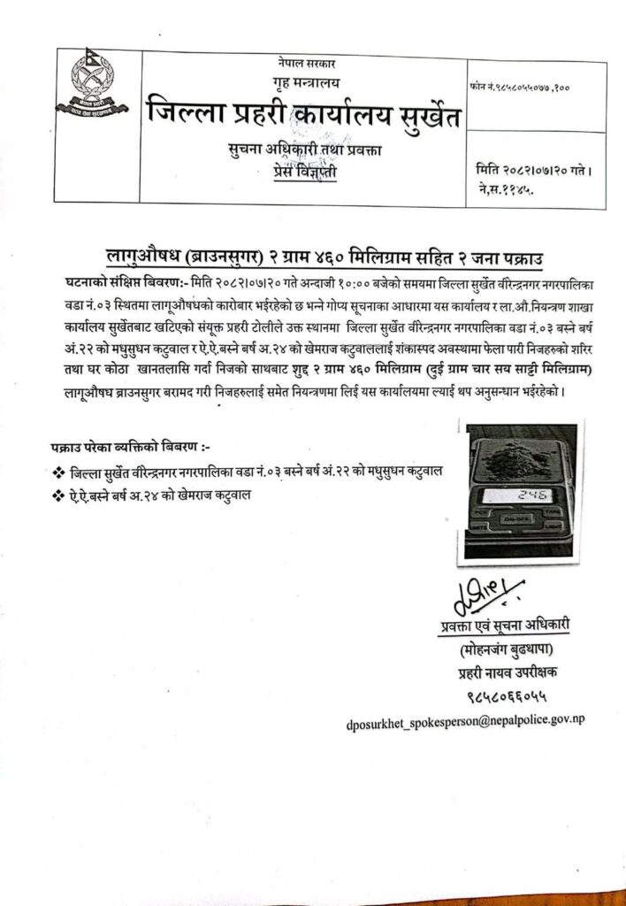 पक्राउ पर्नेहरूमा वीरेन्द्रनगर नगरपालिका वडा नं. ०३ बस्ने वर्ष अन्दाजी २२ का मधुसुधन कटुवाल र सोही स्थानका वर्ष अन्दाजी २४ का खेमराज कटुवाल रहेको प्रहरीले जनाएको छ। उक्त स्थानमा शंकास्पद अवस्थामा फेला परेका निजहरूको शरीर र घरकोठा खानतलासी गर्दा २ ग्राम ४६० मिलिग्राम (दुई ग्राम चार सय साठी मिलिग्राम) लागूऔषध ब्राउनसुगर बरामद भएको हो।
