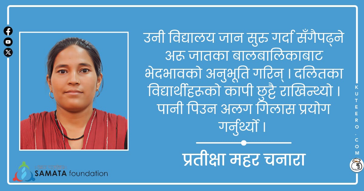 (प्रतिक्षा महर चनारा समता फाउन्डेसनको दलित दलित मानव अधिकार रक्षक हुनुहुन्छ र उहाँ हाल जाजरकोट जिल्लामा रहेर दलित अधिकारको पैरवी गर्दै समतामूलक समाज निर्माण गर्ने गतिविधिमा सक्रिय हुनुहुन्छ।)
