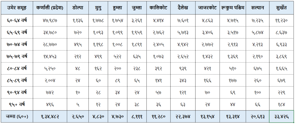 विशेषगरी जुम्ला, हुम्ला, मुगु, डोल्पा र कालिकोट जस्ता हिमाली जिल्लाहरूमा ज्येष्ठ नागरिकको सङ्ख्या न्यून देखिए पनि, ती जिल्लाका कामदार उमेरका व्यक्तिहरूमाथि अर्थात् ‘असामायिक’ रूपमा वृद्धको भूमिका निर्वाह गर्ने दबाब बढी छ। तालिका १ ले देखाएअनुसार यी जिल्लाहरूमा दलित, अपाङ्गता भएका र महिला ज्येष्ठ नागरिकहरूको संवेदनशील स्थिति र भौगोलिक अवरोधहरूले यो दबाबलाई अझो जटिल र निर्मम बनाएको छ।