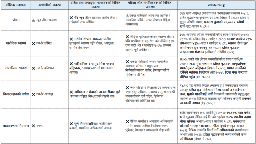 यस तालिकाबाट कर्णालीमा “थपिएको आयु” (जीवन सक्षमता) को प्राप्तिलाई “गुणस्तरपूर्ण जीवन” (बाँकी सक्षमताहरू) को ह्रासले ढाकेको छ। दलित र अपाङ्गता भएका जेष्ठ नागरिकहरूका लागि यो ह्रास जातीय र शारीरिक अवरोधहरूले गुणनात्मक रूपमा बढाइएको छ। ज्येष्ठ नागरिक भत्ता, वृद्धाश्रम, राष्ट्रिय परिचयपत्रको सास्ती, र राष्ट्रिय स्वास्थ्य बीमा कार्यक्रमको विफलता—यी सबैले मिलेर उनीहरूलाई गरिमामय जीवन बाँच्ने सबै आधारभूत क्षमताबाट वञ्चित गरेको छ। यसले वृद्धावस्थालाई “अस्तित्वगत एक्लोपना” को अवस्थामा परिणत गरेको छ, जीवित त छन्, तर जीवन सार्थक छैन।