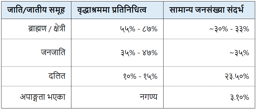 नेपालका महिलाहरू अक्सर त्याग गरिने जोखिममा हुन्छन् यदि उनीहरूका श्रीमानको मृत्यु भएमा र उनीहरूका सन्तान पलायन गर्छन्। पैतृक सम्पत्तिमा कानूनी वा सामाजिक नियन्त्रण बिना, धेरै बृद्ध महिलाहरूले आफूलाई घर बिना पाउँछन्, जसले गर्दा उनीहरू बृद्धाश्रममा शरण खोज्छन्। हेरचाह घरका निवासीहरूको जाति र जातीय विभाजनले जटिल तस्बिर प्रस्तुत गर्दछ। धेरै सहरी घरहरूमा, “उच्च जाति” समूहहरू, विशेष गरी ब्राह्मण र क्षेत्रीहरूको आश्चर्यजनक रूपमा उच्च प्रतिनिधित्व छ।