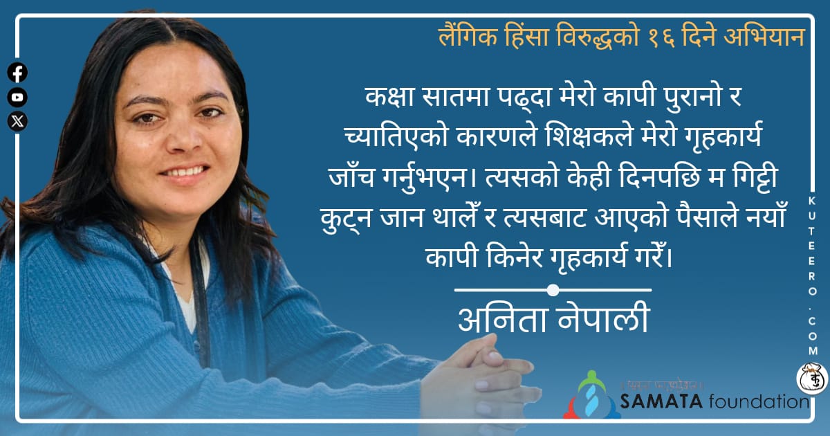 नमस्कार म अनिता नेपाली। जुम्ला जिल्लाको चन्दननाथ नगरपालिका–३ (तत्कालीन चन्दननाथ गा.वि.स.) डाडाकोटमा २२ वर्ष अगाडि मेरो जन्म भएको हो। मेरो बाल्यकालको सुरुवातदेखि नै हाम्रो परिवार अरू दलित परिवारभन्दा फरक र आत्मनिर्भर थियो।