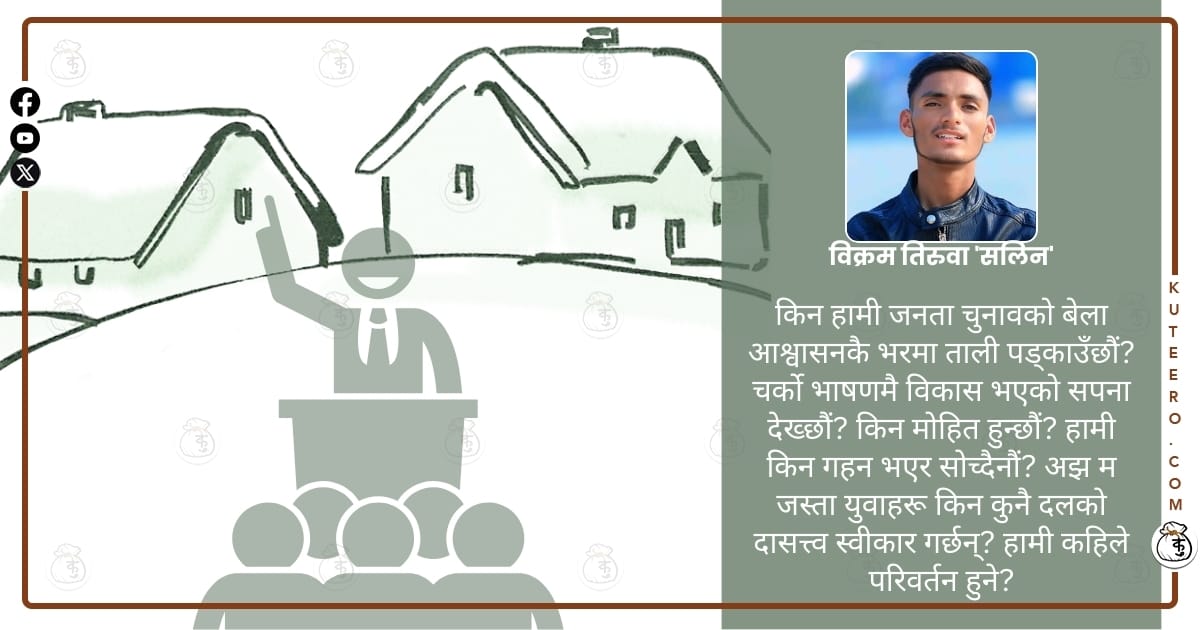 किन हामी जनता चुनावको बेला आश्वासनकै भरमा ताली पड्काउँछौं? चर्को भाषणमै विकास भएको सपना देख्छौं? किन मोहित हुन्छौं? हामी किन गहन भएर सोच्दैनौं? अझ म जस्ता युवाहरू किन कुनै दलको दासत्त्व स्वीकार गर्छन्? हामी कहिले परिवर्तन हुने?